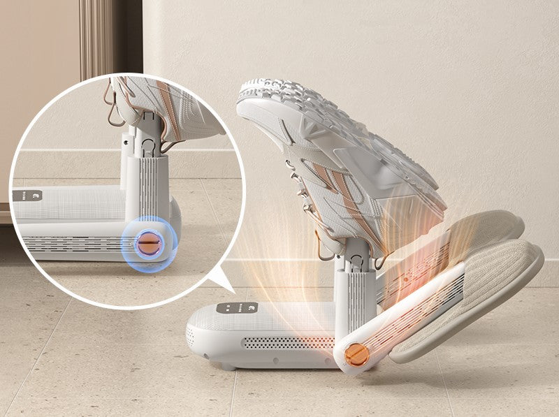 Buty zwykle są suche w około 30–60 minut, w zależności od materiału i wilgotności. Podwójny wspornik V i delikatne ogrzewanie zapewniają równomierne suszenie, bez ryzyka uszkodzenia.